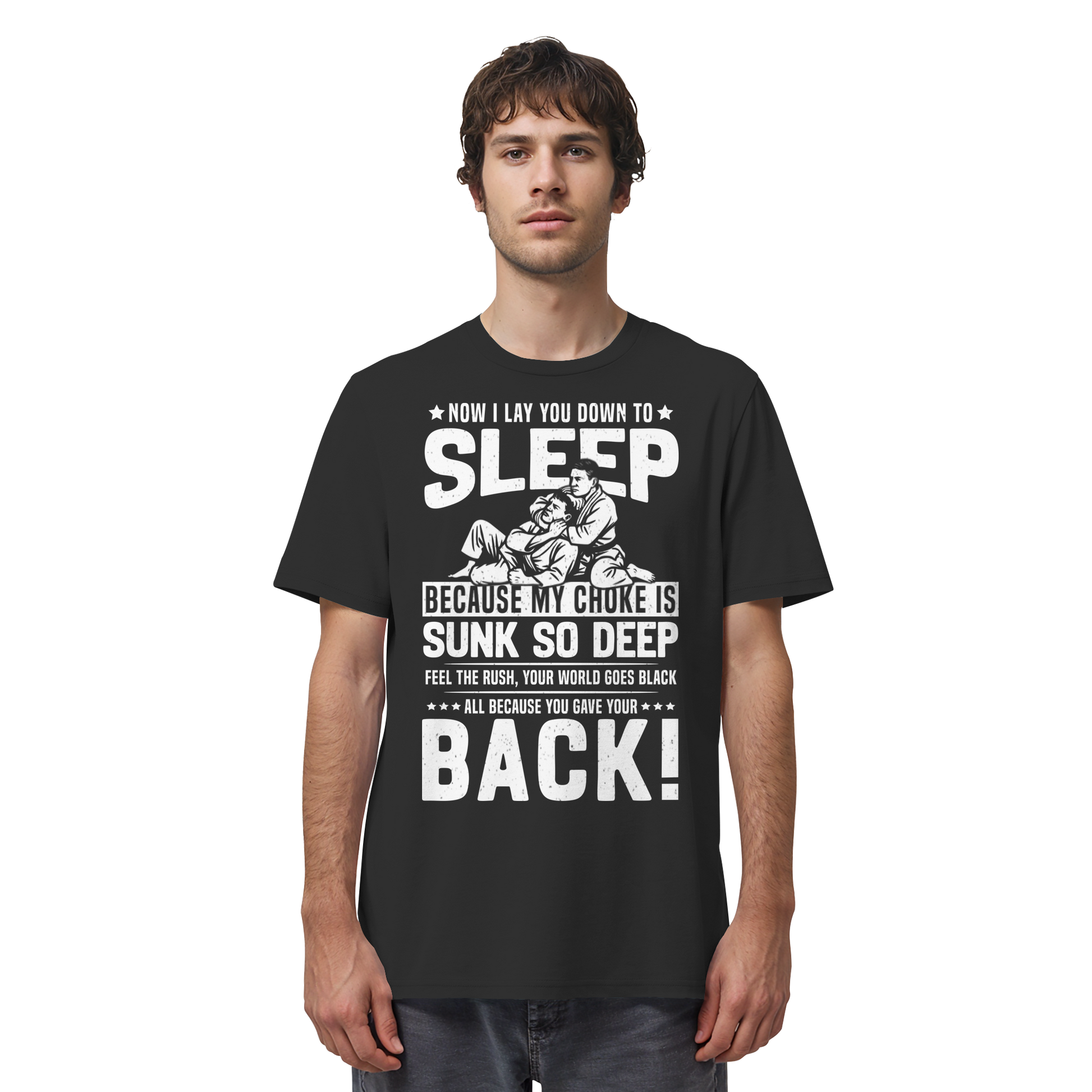 Dieses Design ist eine kompromisslose Mischung aus schwarzem Humor, technischer Dominanz und klassischer Jiu-Jitsu-Attitüde. NOW I LAY YOU DOWN TO SLEEP spielt bewusst mit bekannten Formulierungen – und dreht sie brutal ehrlich in die Realität der Matte.